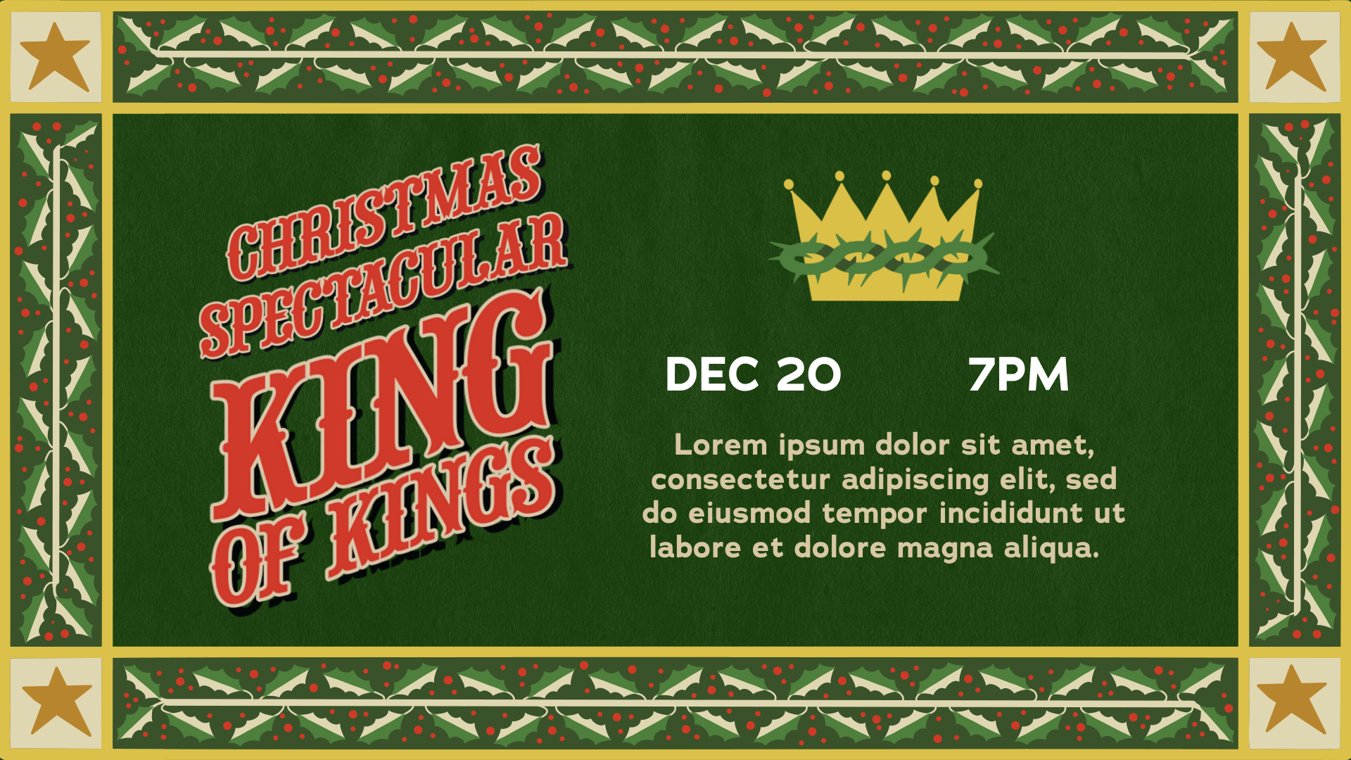 The client wanted to design an experience that would bring families into the sacred story as well as act as a backdrop for a Christmas variety show that happens annually. I was tasked with creating an animated opener as well as promotional graphic templates.